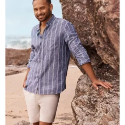 New 😀 Gazman Pure French Linen Stripe Long Sleeve 👕 Shirt In Navy 😍