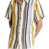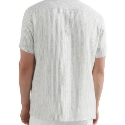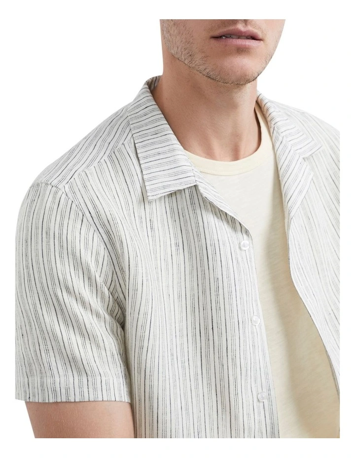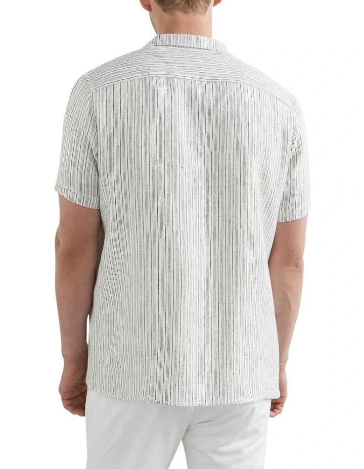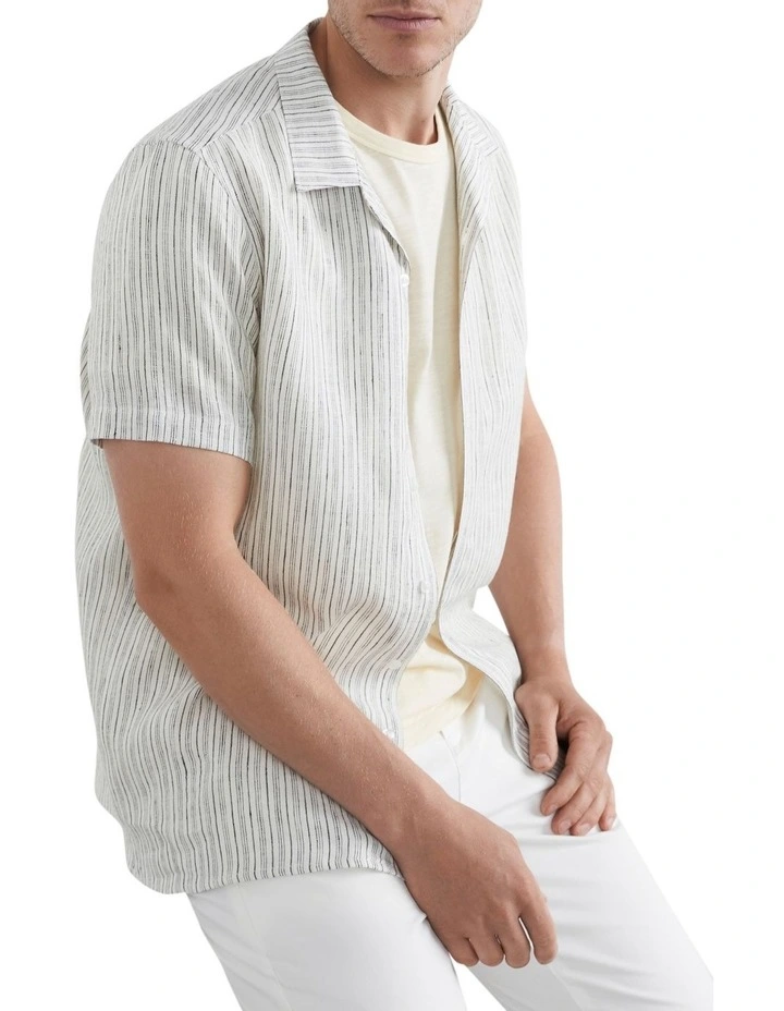 Our Linen Camp Classic Fit Shirt is a summer must-have. Made from 100% linen, this stylish shirt offers a fine detailed stripe, regular fit, short sleeves, curved hemline, button collar and button down design. Pair with our Cropped Straight Jean and Reid Cross Over Leather Slide. Our model is 188cm tall and wears a size M.