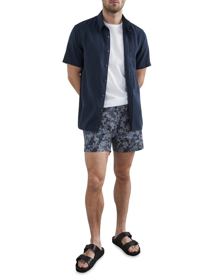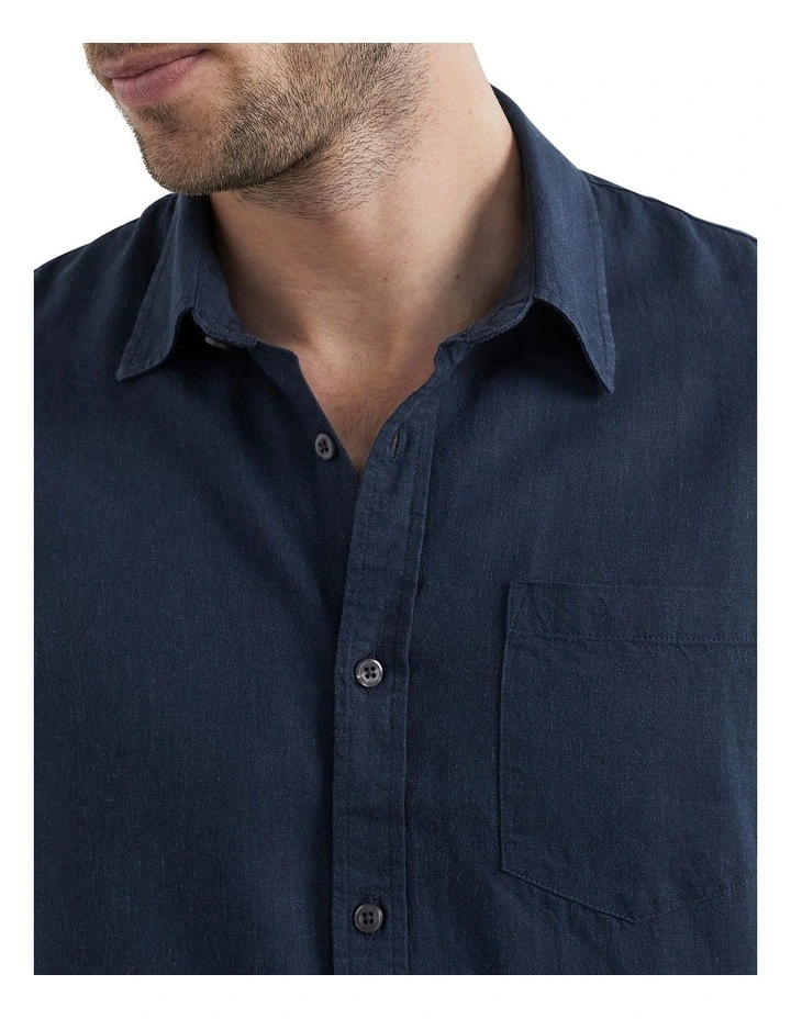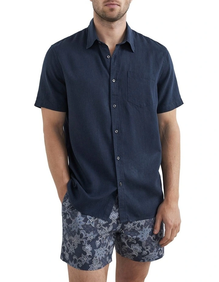 Our Linen Tencel Classic Fit Shirt is perfect for heading into the warmer months. Featuring short sleeves and a comfortable classic fit, paired with a single chest pocket, button through detail and back yoke. Made from a linen Tencel blend, it can be worn buttoned up or open for a more relaxed look. Wear with our Tapered Crop Pant and Zane Leather Slide. Model wearing our Parchment colourway wears a size M. He usually wears a standard M and is 188cm tall.Model Wearing our Sky Blue, French Navy and Oatmeal/Parchment colourways wears a size M. He usually wears a standard M and is 185cm tall.