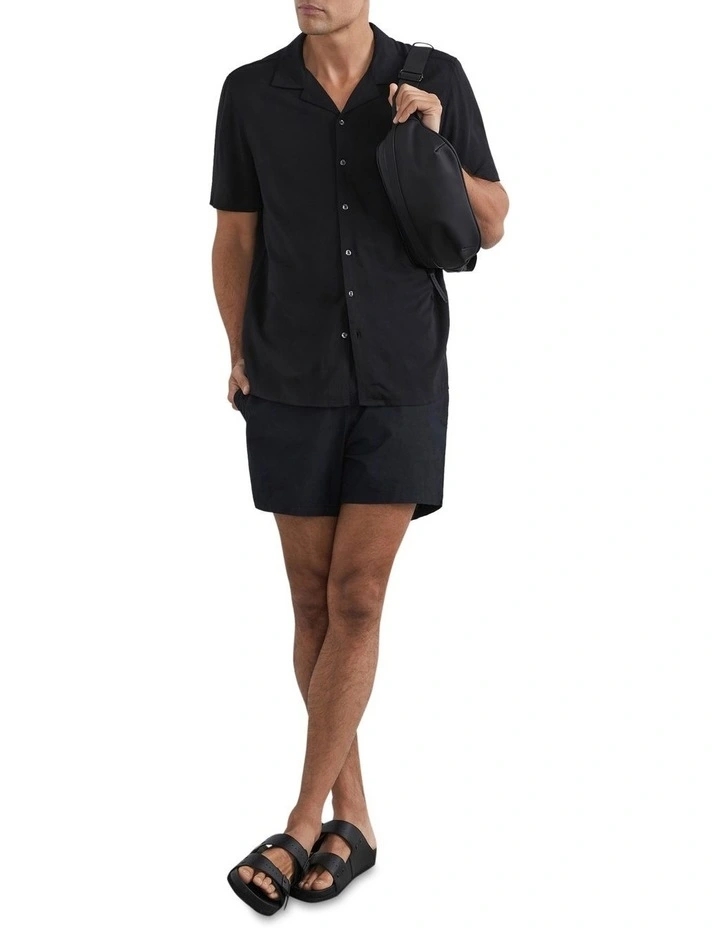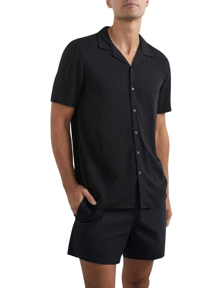 Our Viscose Camp Collar Classic Fit Shirt delivers effortless style. Available in multiple colourways, this solid colour casual shirt features a comfortable regular fit, camp collar, button down design and short sleeves. This garment is made from LENZING ECOVERO, an eco-responsible viscose fibres made from naturally biodegradable wood pulp. Pair with our Cropped Straight Jean and Reid Leather Crossover Slide. Model wearing our Khaki colourway wears a size AU M. Our model is 187cm tall. Model Wearing our Black colourway wears a size AU M. Our model is 188cm tall.