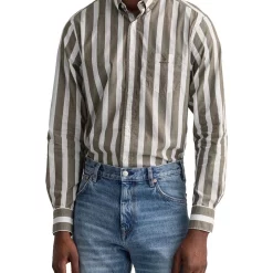 Crafted in a classic cotton broadcloth, this regular fit banker stripe shirt has our signature button-down collar, shield logo embroidery, and locker loop and boxpleat at the back.