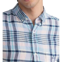 Breathable linen meets preppy madrasa summer staple for decades. This Regular Fit Madras Linen Shirt is a casual summer essential, and features a button-down collar, logo embroidery at the chest, and our innovative boxpleat and locker loop at the back.