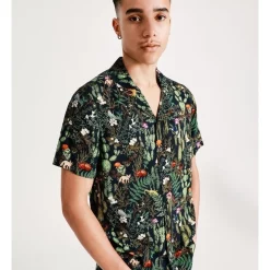 Make a statement in a short sleeve shirt. This shirt has a button up opening with a bold, all-over print. Wear it with denim for an elevated casual look.Β