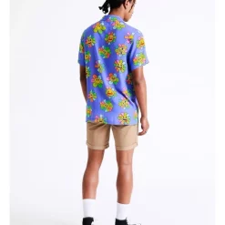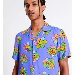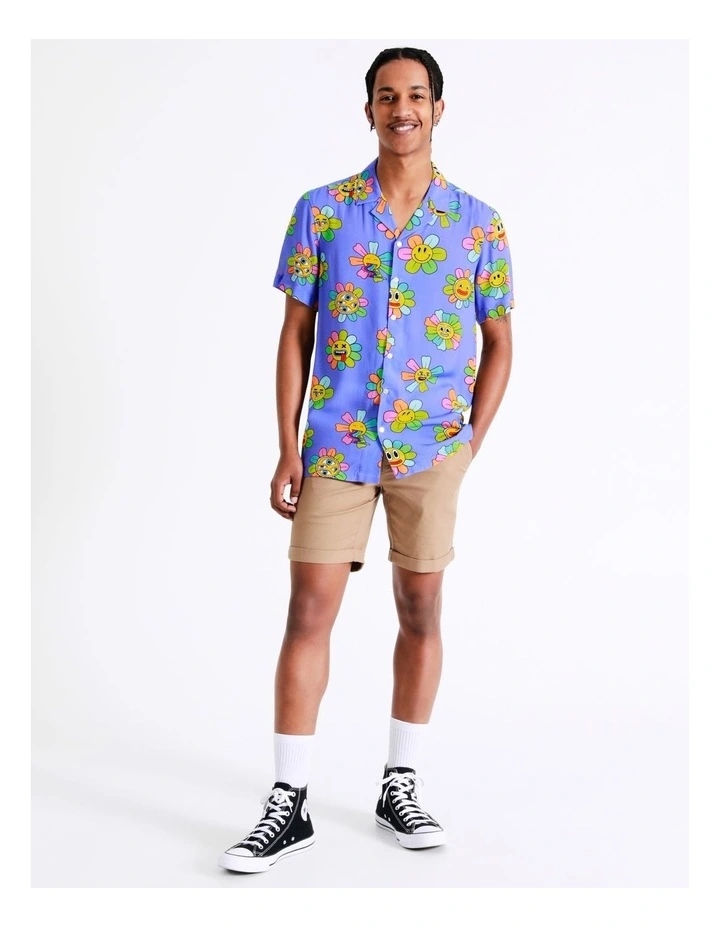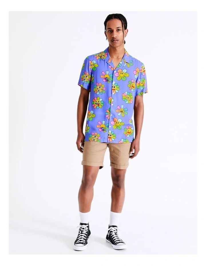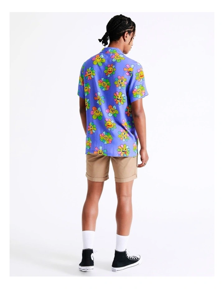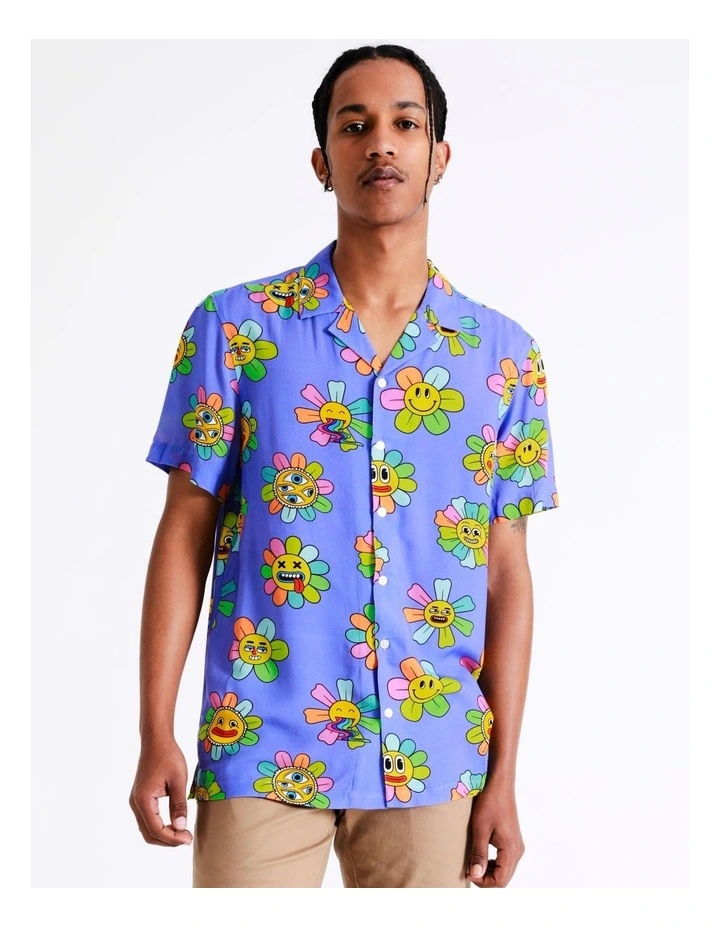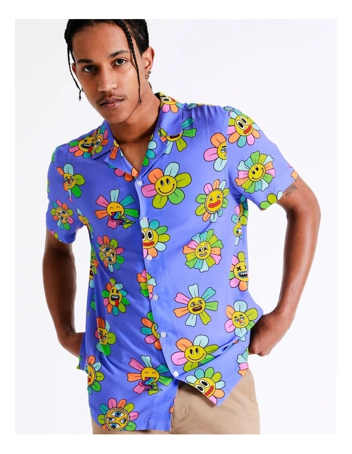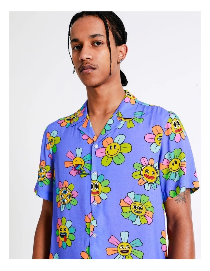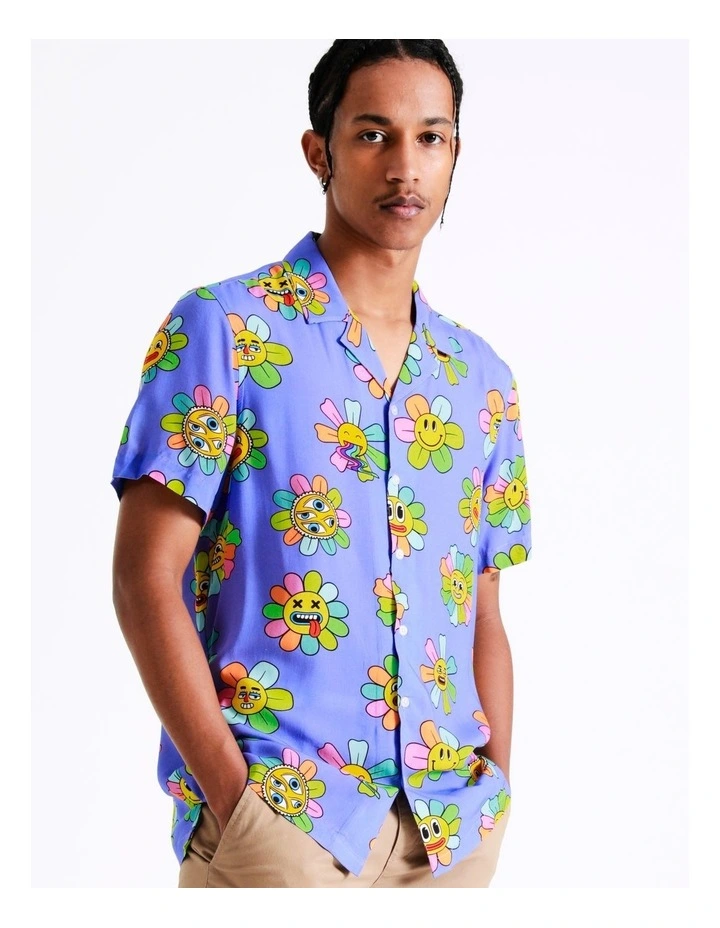 KenjiΒ Peace Smiles Print Short Sleeve Rayon Shirt in Purple