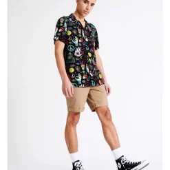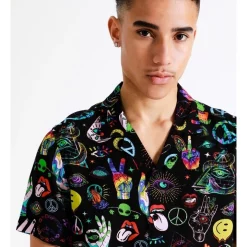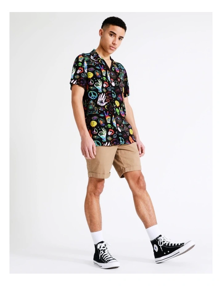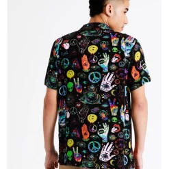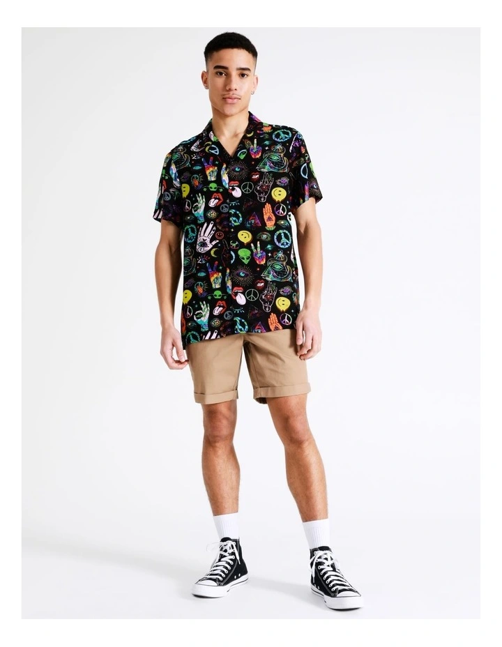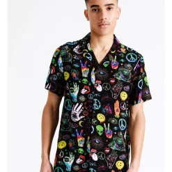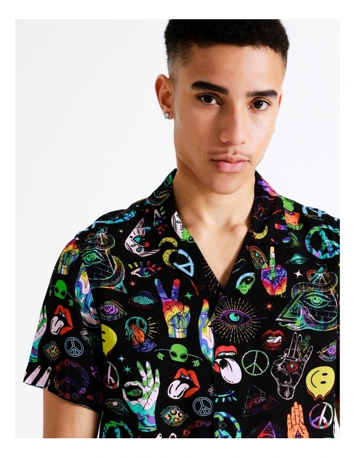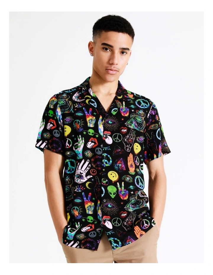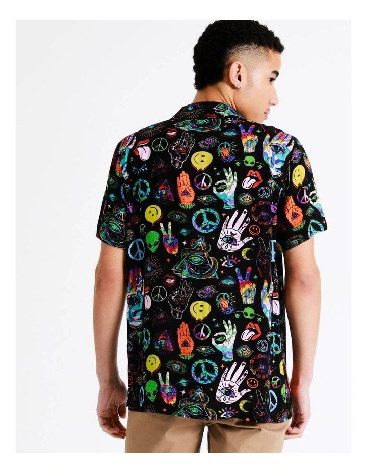KenjiΒ Peace Trip Print Short Sleeve Rayon Shirt in Black
