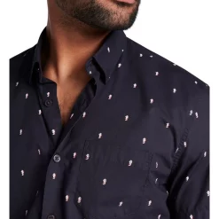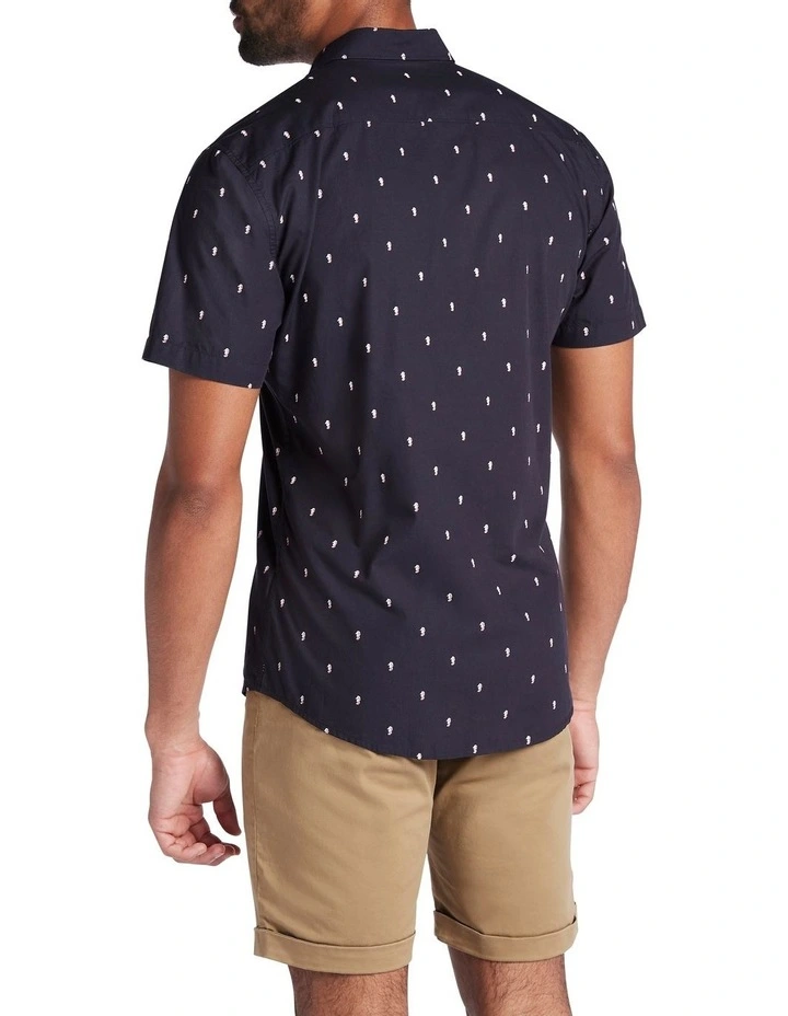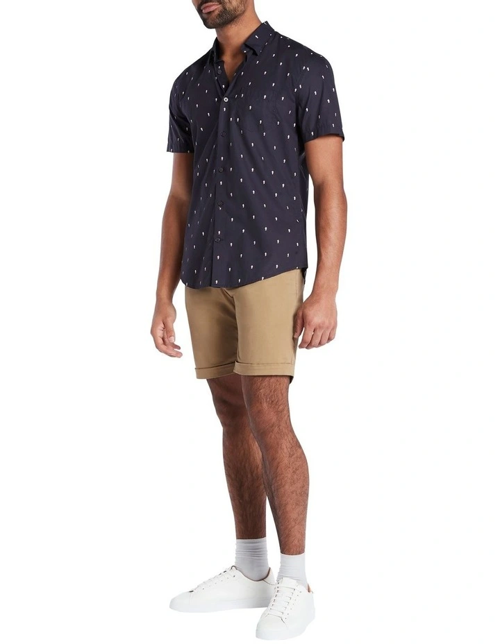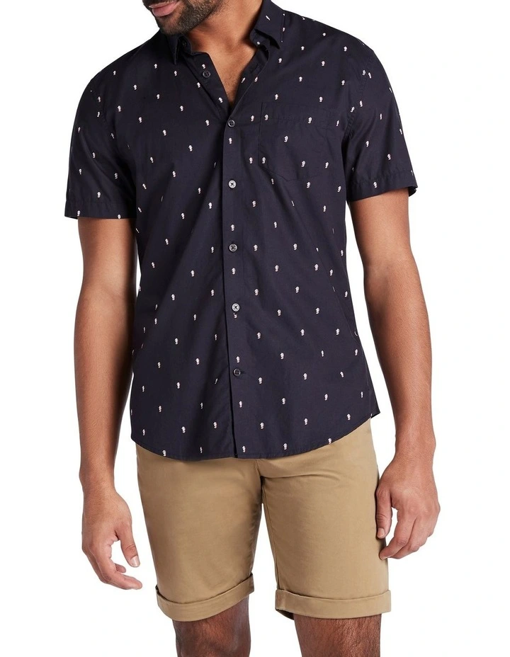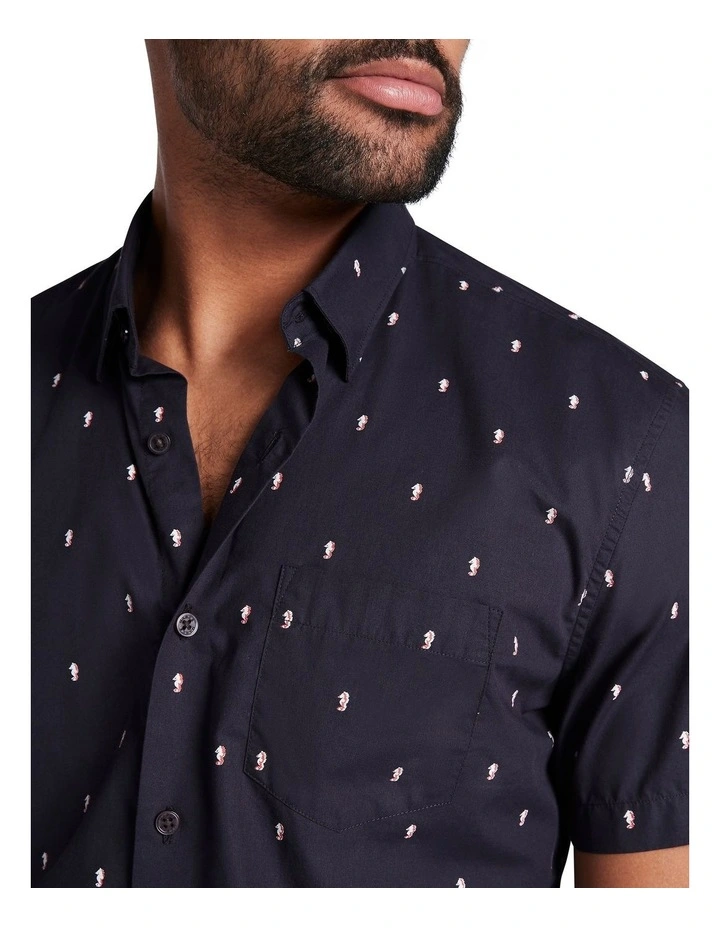 Intricate in its print, this short sleeve shirt shows off a small seahorse design, set against a rich navy base of soft, lightweight cotton. Offering a regular fit through to curved hem shaping, the shirt delivers further detail in its sharp shirt collar, front fastening with dyed-to-match Marcs branded buttons, and single patch pocket at the chest.