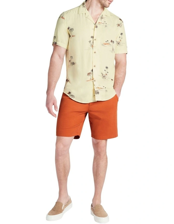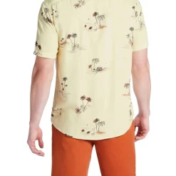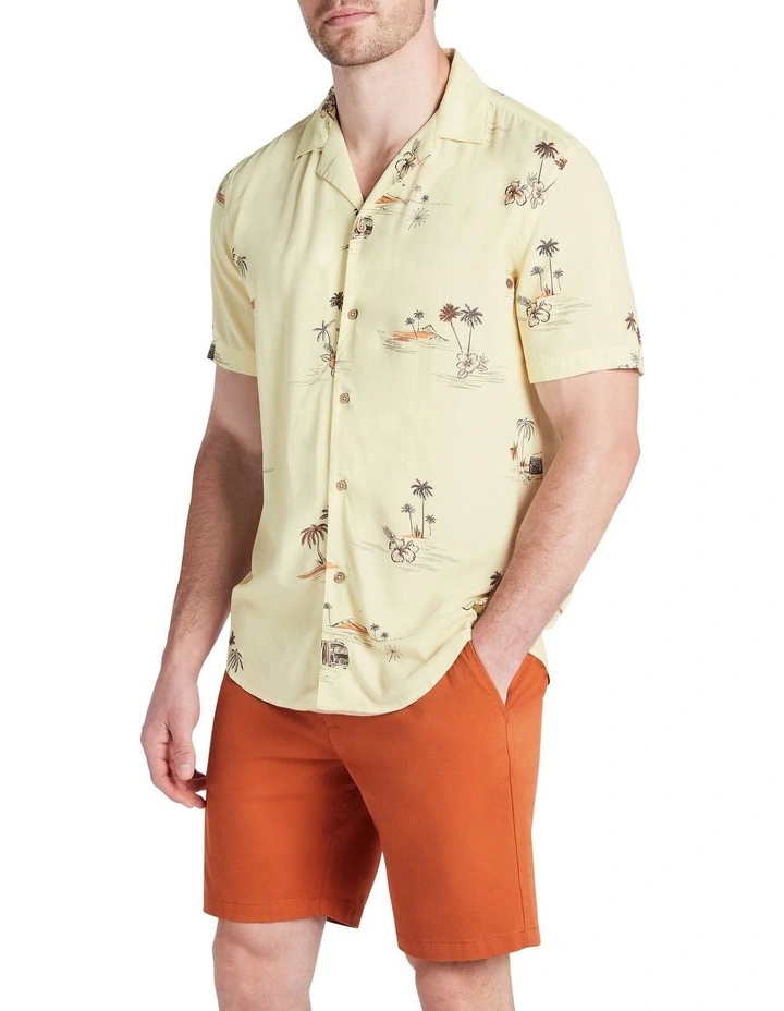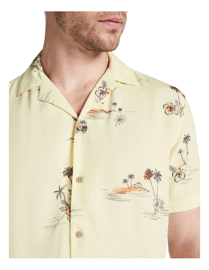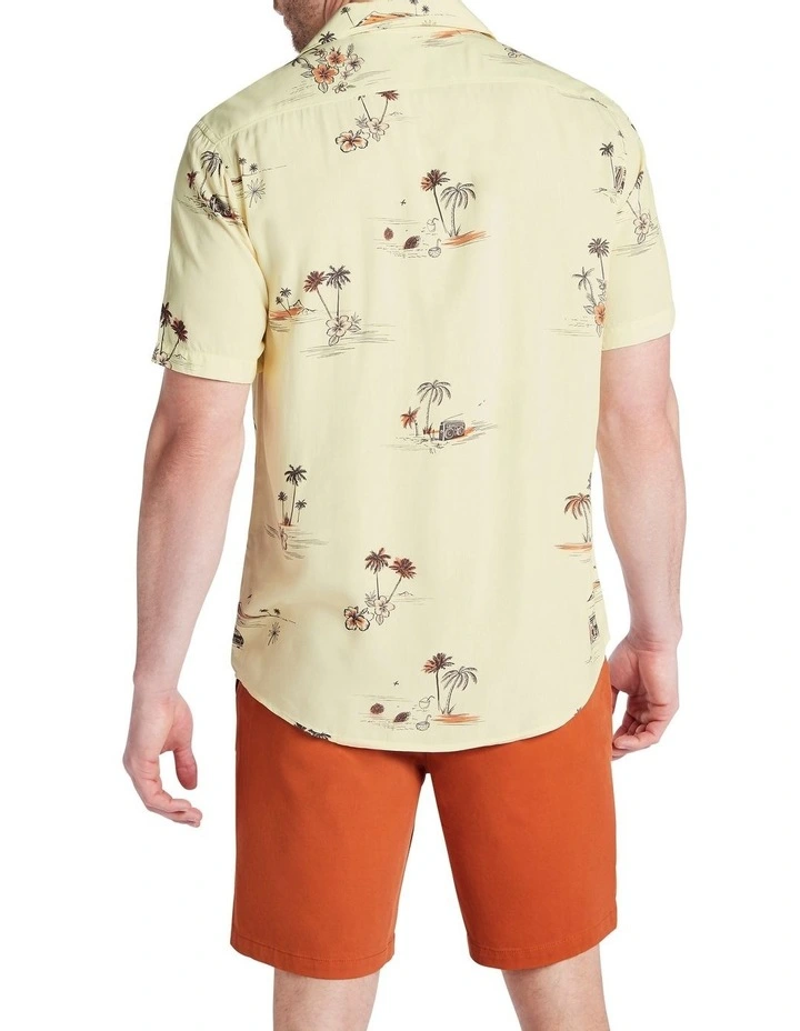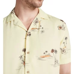 Bringing summer to your wardrobe, this shirt skims over your skin with soft, lightweight fabric, to reveal a tropical print set against a pale yellow base. Offering a regular fit with curved shaping at the hem, the shirt is completed by an open collar and full button front closure, featuring wood-look buttons.