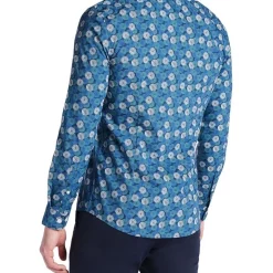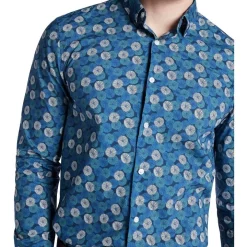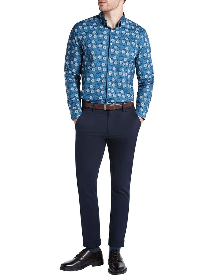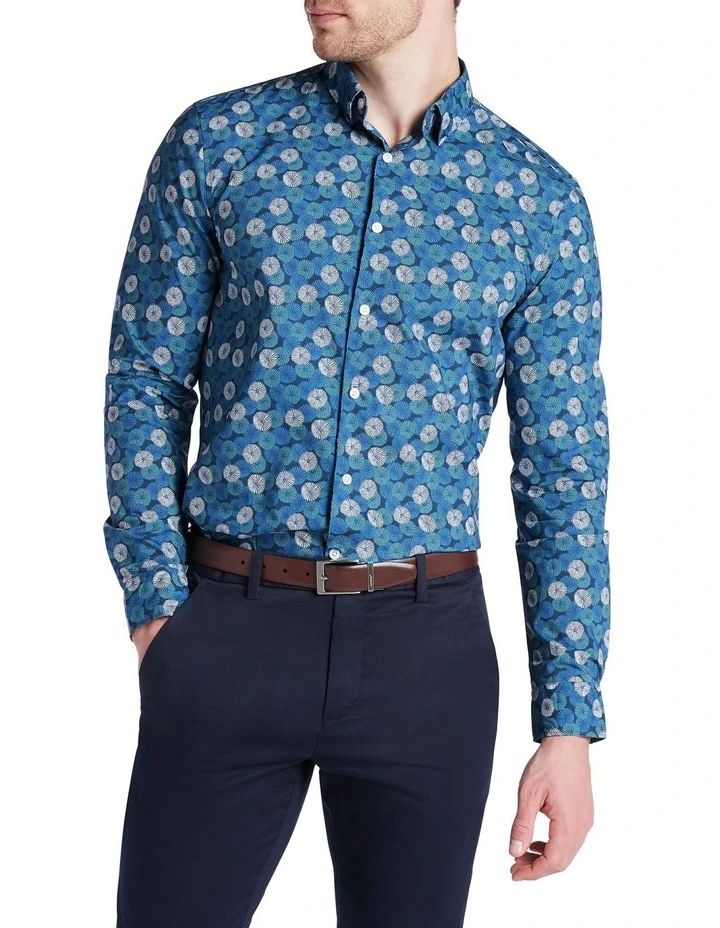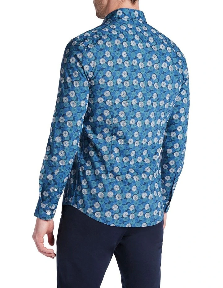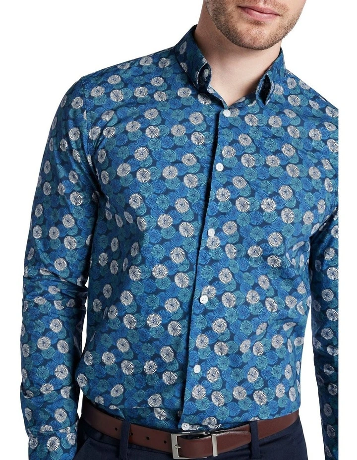 Playing shades of teal, blue and ivory against a darker blue base, this long sleeve shirt flaunts a gorgeously detailed print, set against pure, lightweight cotton. Fastening at the front with contrast Marcs branded buttons, the shirt flatters within a slim fit, with further detail found in curved hem shaping, a sharp shirt collar, and a triple button closure at the cuff.