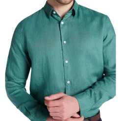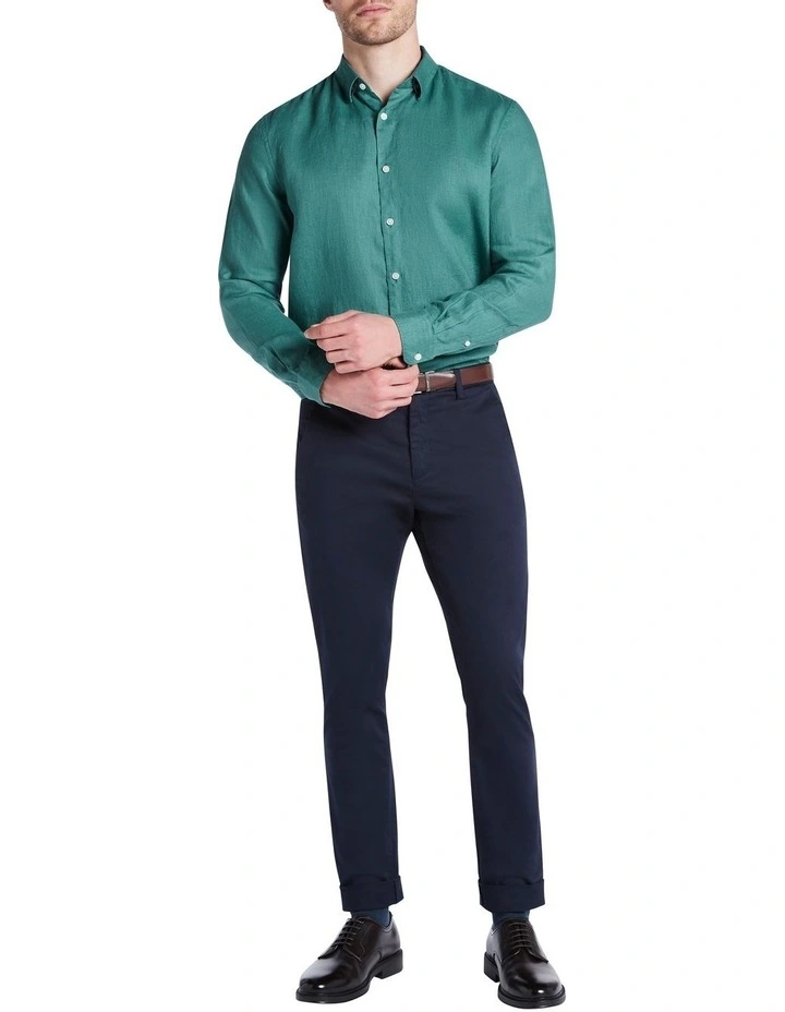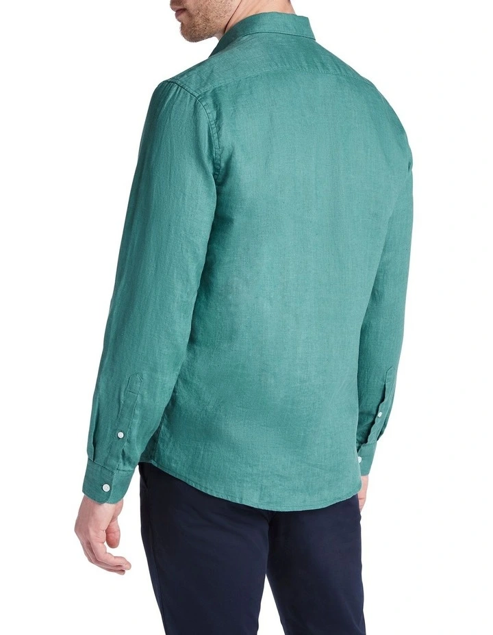 Entirely effortless, this long sleeve shirt makes dressing for summer oh-so easy, offering up a delightful shade of zucchini green paired with contrast white buttons. Lightweight and breathable in pure linen, the shirt creates a regular fit with curved shaping at the hem, and is completed by a sharp shirt collar, a classic button front closure, and neat button-up cuffs.