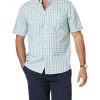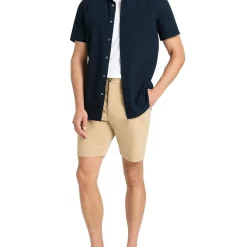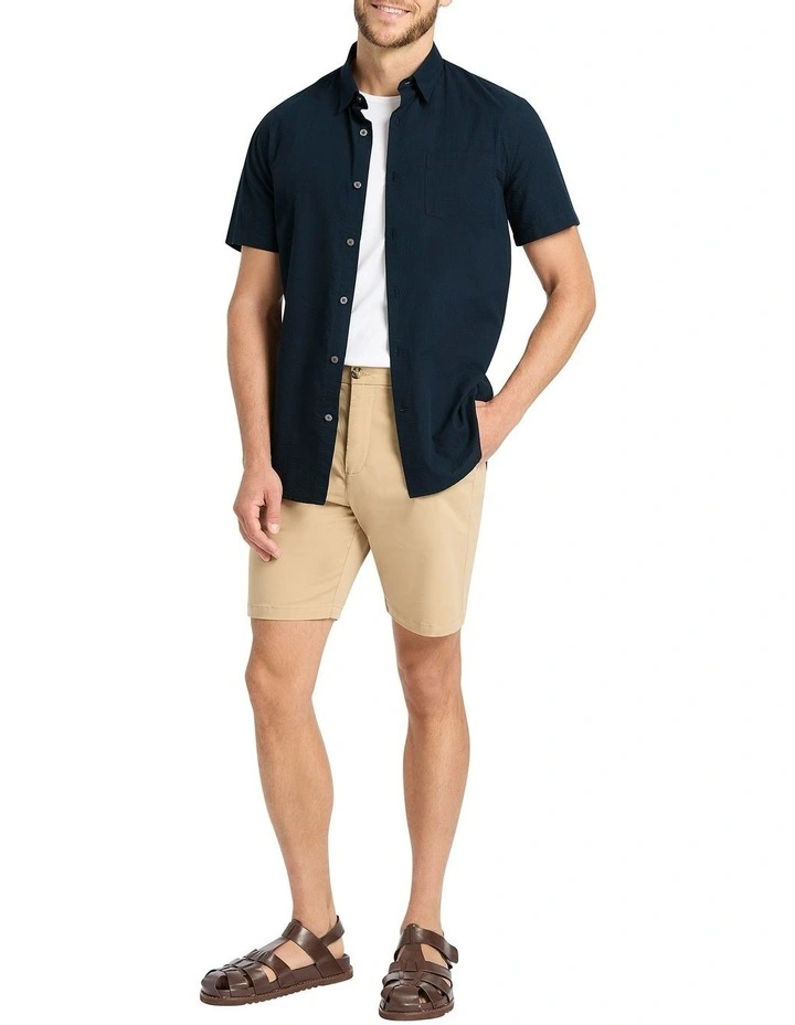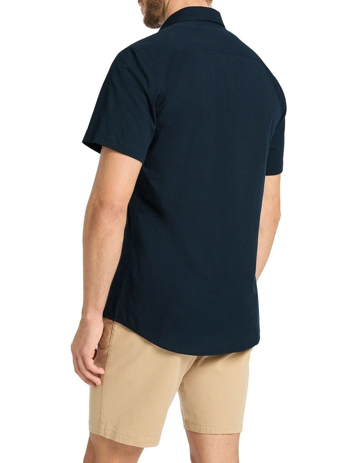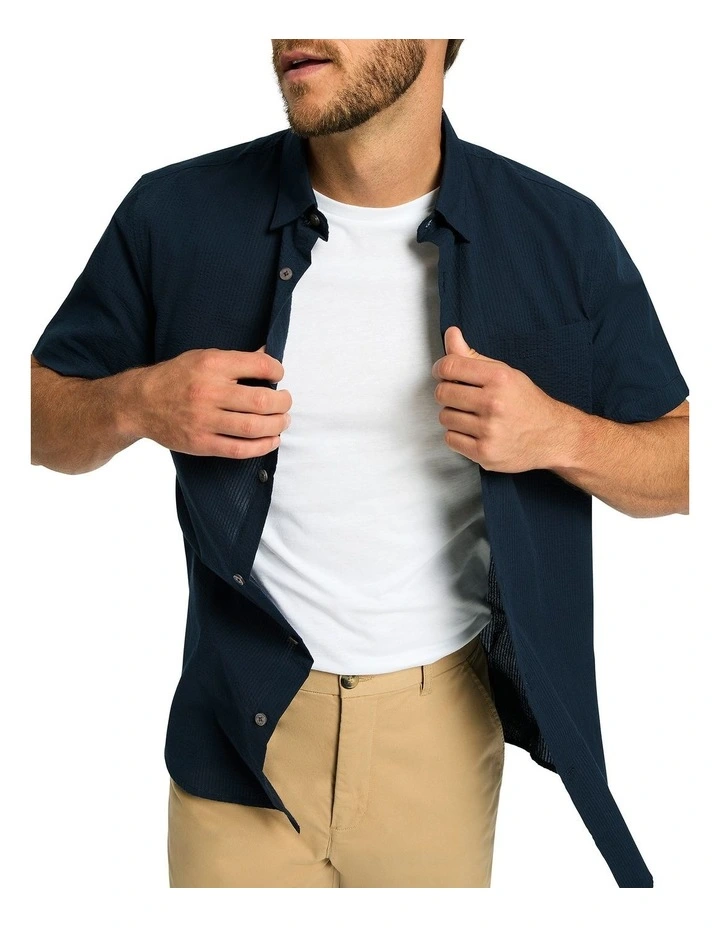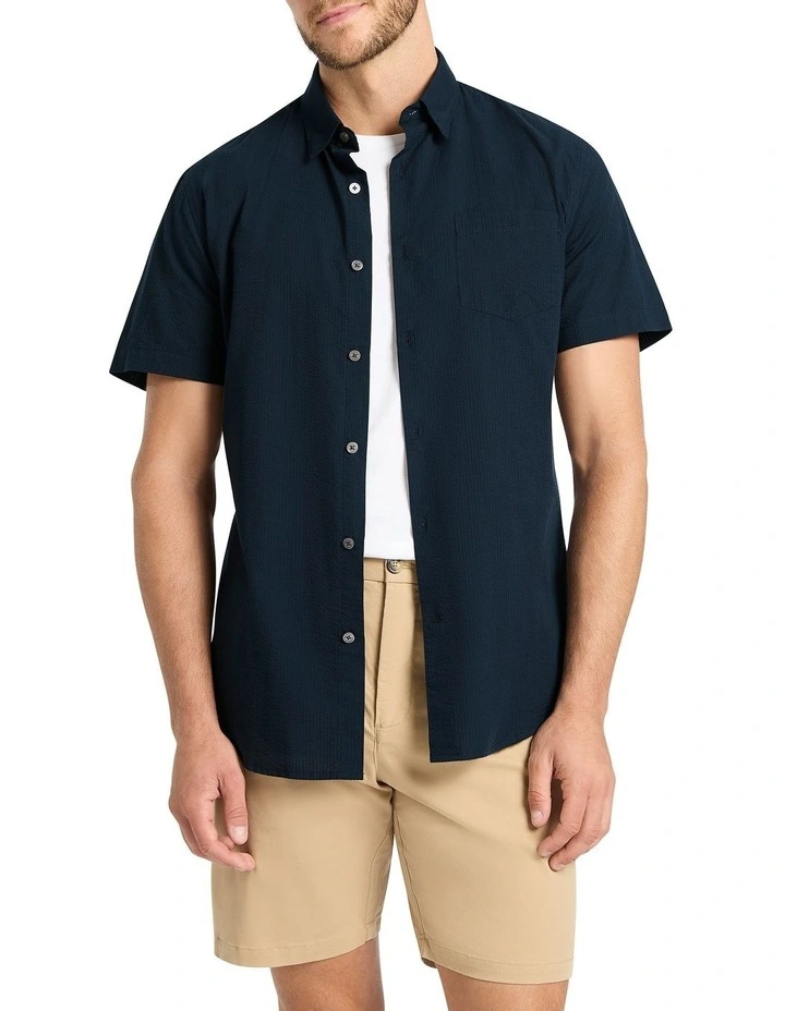 Revealing a softly textured vertical stripe within its fabric, this navy short sleeve shirt delivers cool, comfortable styling that can be layered over a tee or buttoned up on its own. Creating a regular fit with curved shaping at the hem, the shirt fastens at the front with contrast buttons, with further detail found in a sharp shirt collar and a single patch pocket at the chest.