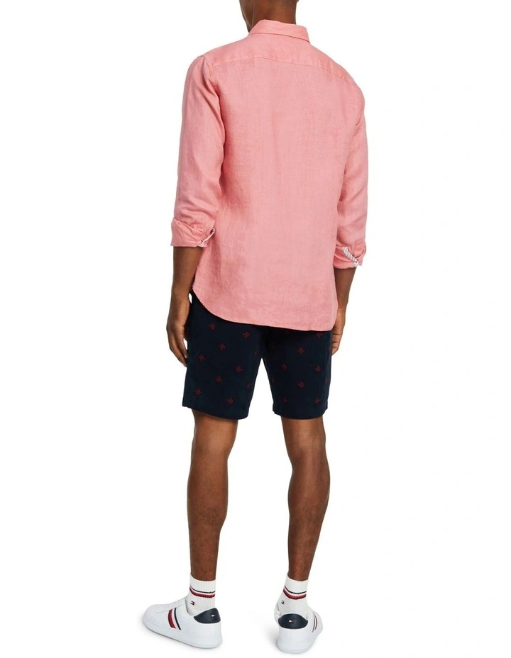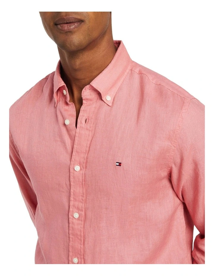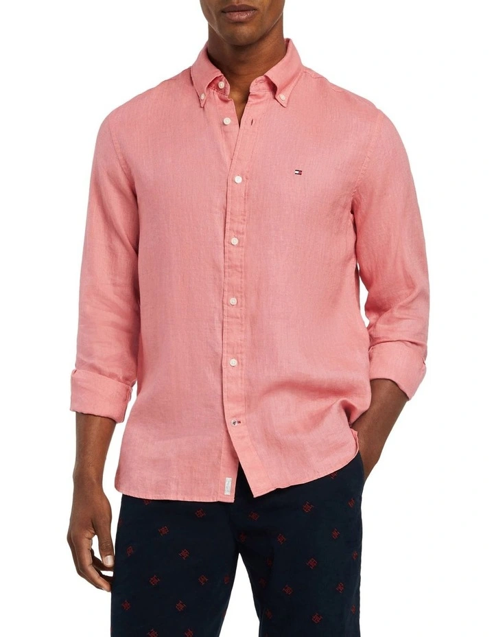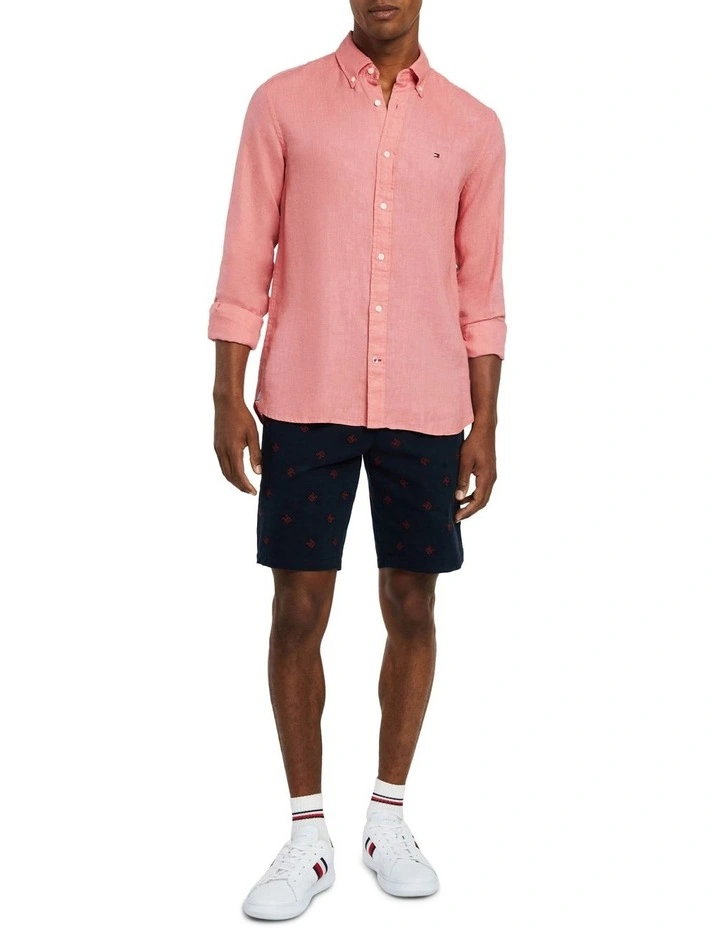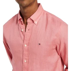Crafted from pure linen, this shirt features Tommy Hilfiger flag embroidery on the pocket and a button down collar, perfect for transeasonal weather.